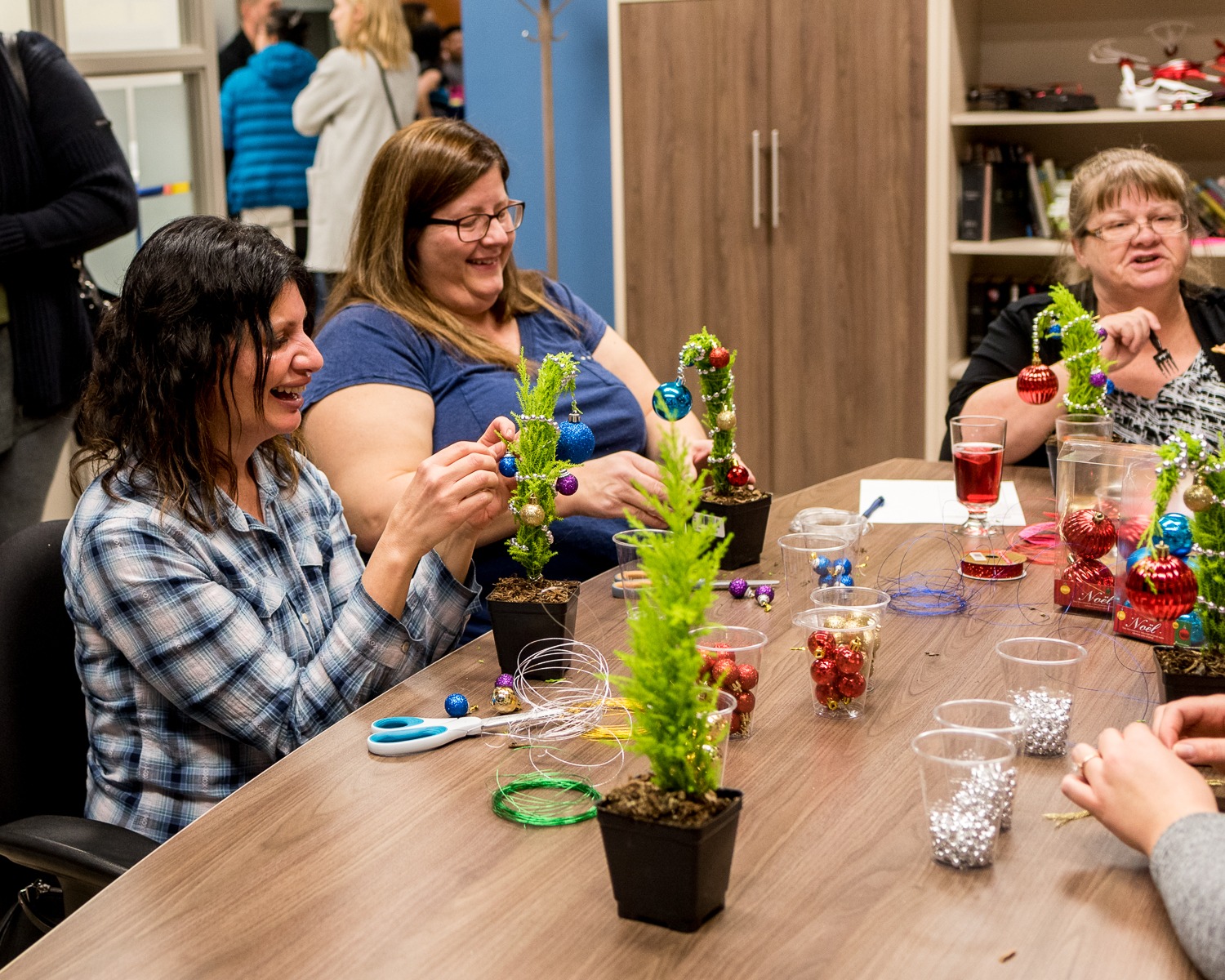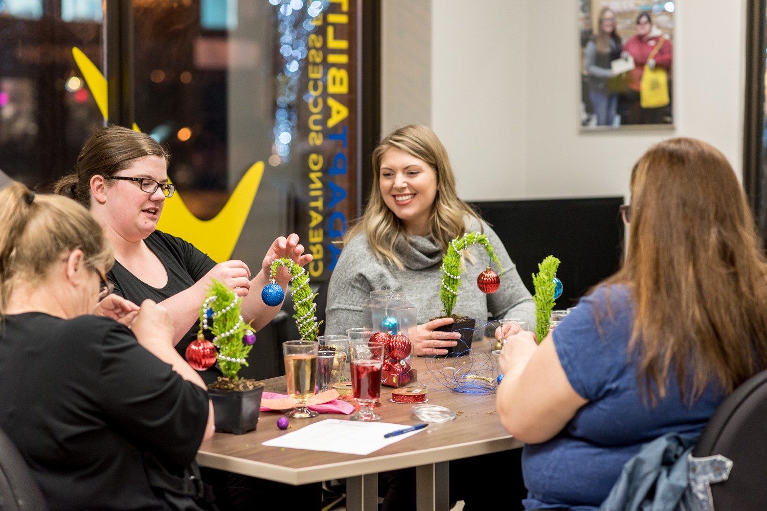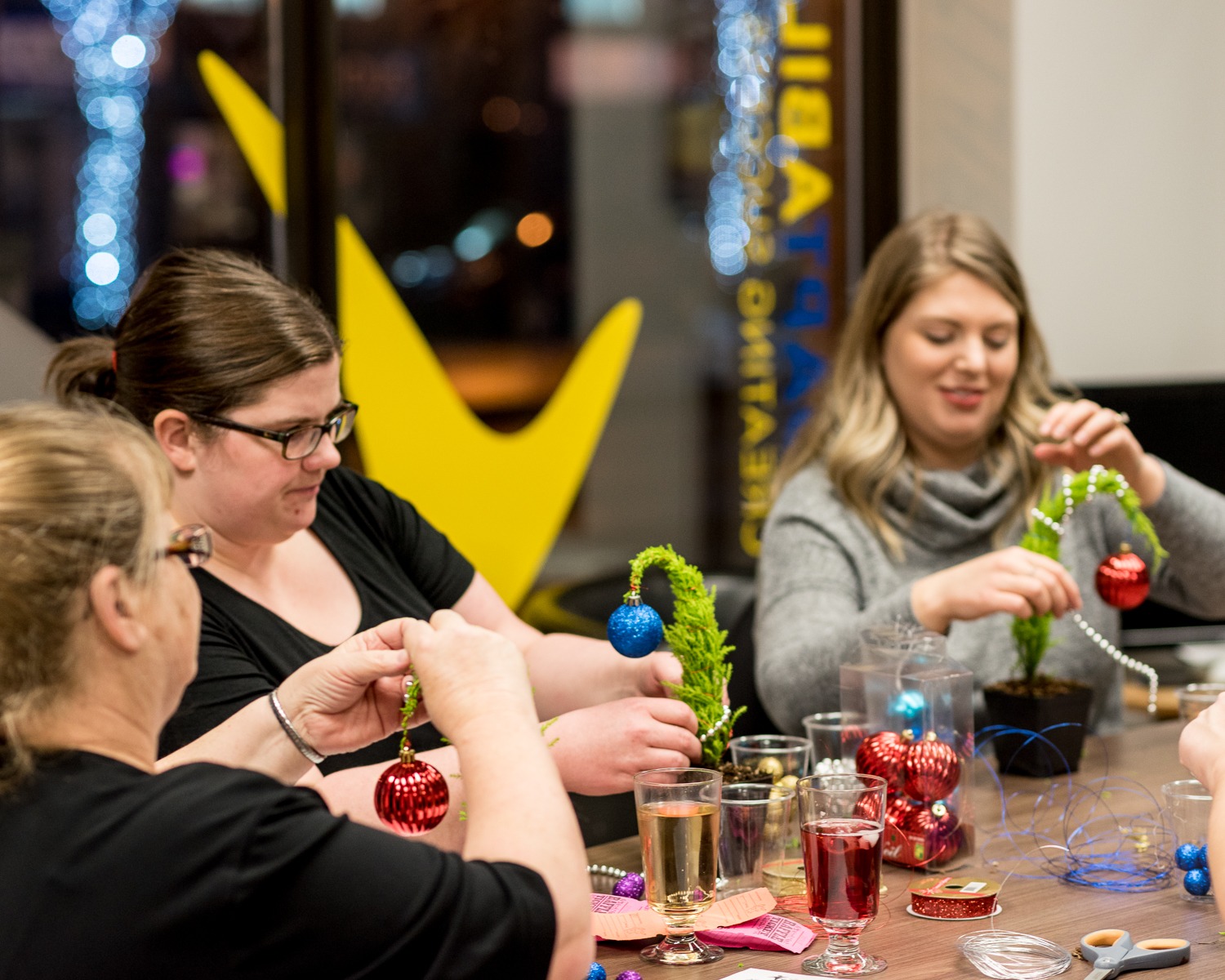 With peace of mind knowing that the kids were taken care of – the families participated in a variety of self-care activities. We had massage therapists to help us relax,(courtesy of YEG MobileMassage), hair stylists to make us feel our best (courtesy of the Industry Hair Studio), phenomenal food & drinks to fill our soul (courtesy of AlleyKat Brewery & the catering team at NAIT), and even miniature Grinch Whoville tree workshops!